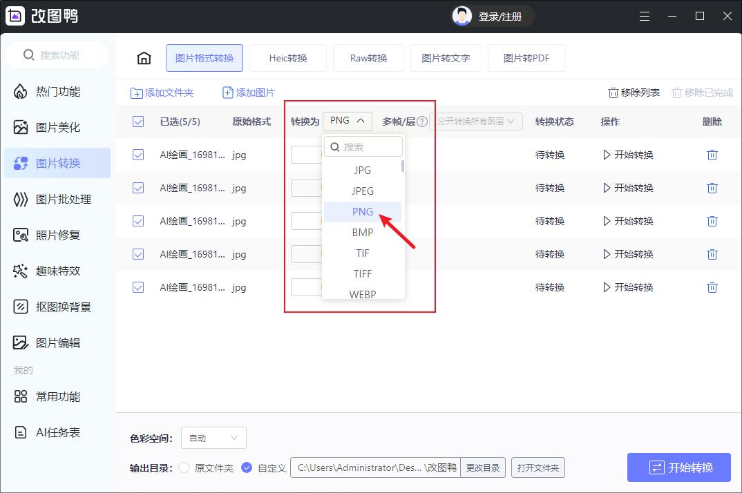步骤二:所有图片导入完成后,界面下方会显示格式设置选项。在这里找到输出格式下拉菜单,从列表中选择PNG格式作为目标格式。同时设置输出目录,建议新建专用文件夹存放转换后的文件。