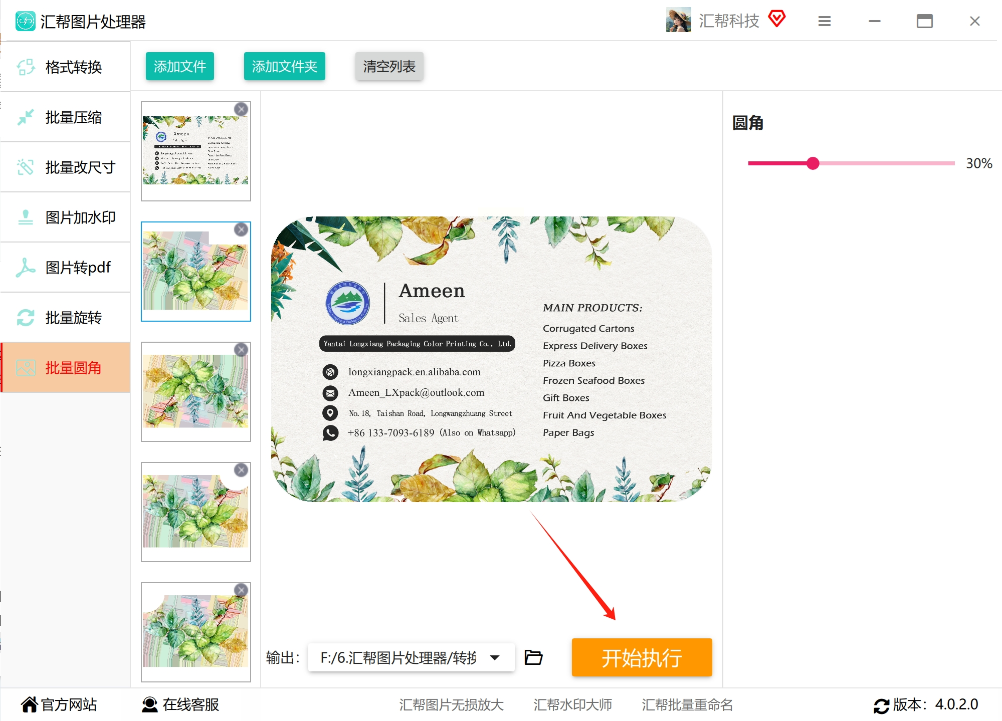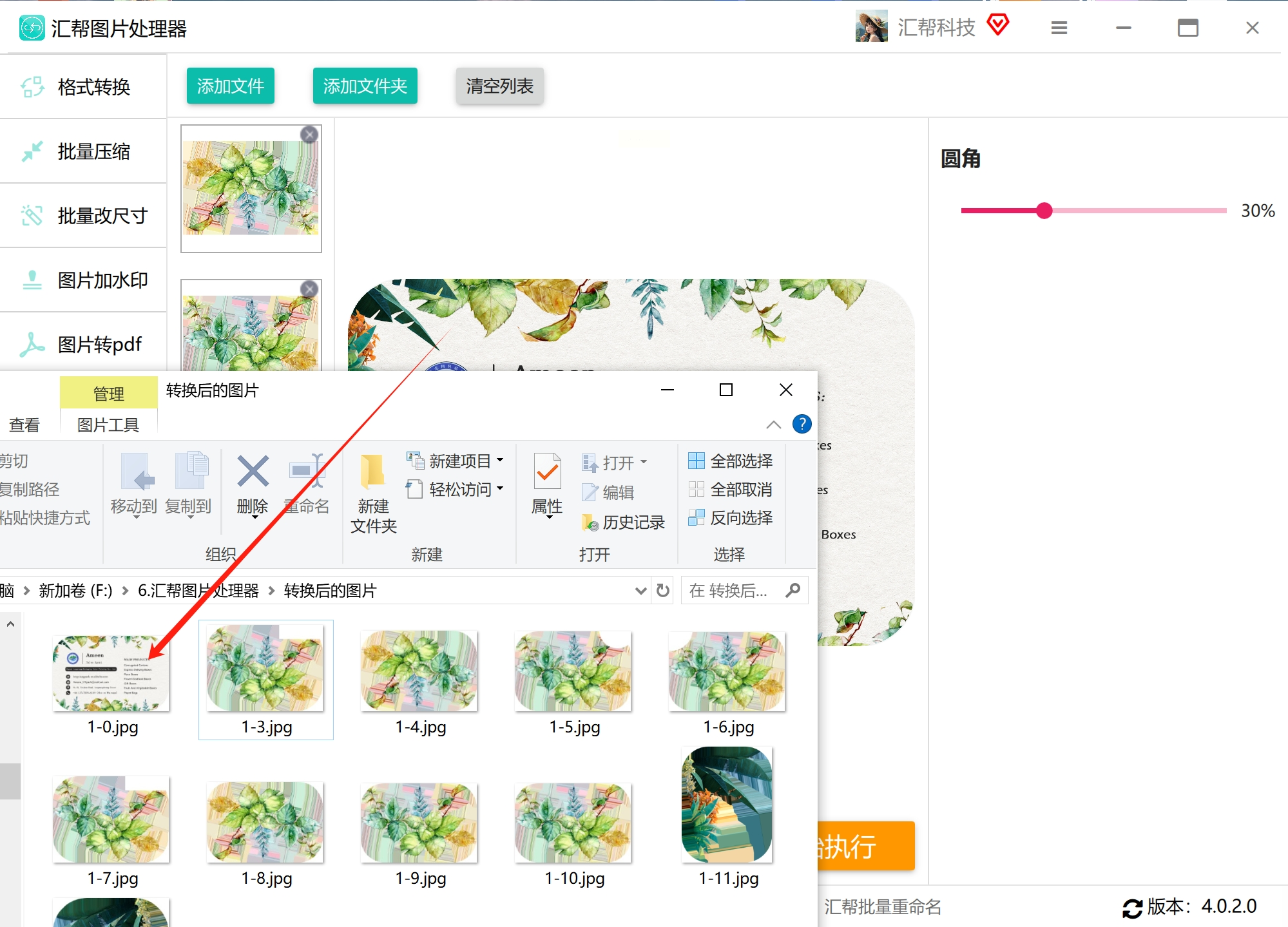 6. 点击【开始处理】或【批量转换】等类似的执行按钮,软件便会自动按照设定参数为所有图片添加圆角。