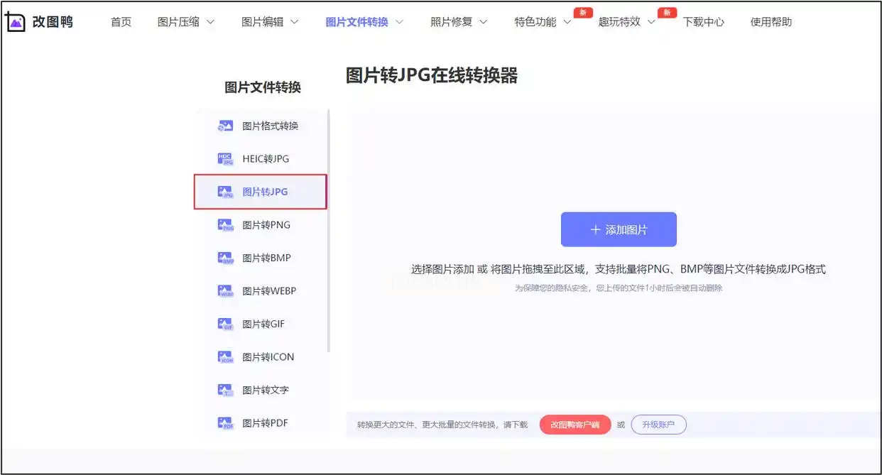 使用方法是:在浏览器中访问改图鸭,找到“图片转换”相关功能,选择“转JPG”。点击页面上的“添加图片”按钮,上传BMP文件。网站通常会自动开始转换,转换完成后,页面上会出现“下载”按钮,点击它就能保存转换后的JPG图片到电脑里。
