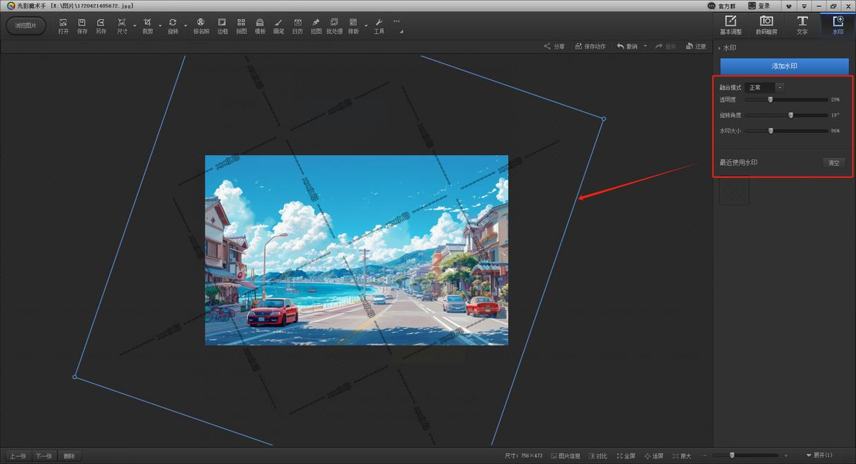- 旋转角度:如果需要倾斜水印,可拖动旋转滑块调整角度,让水印更有设计感。