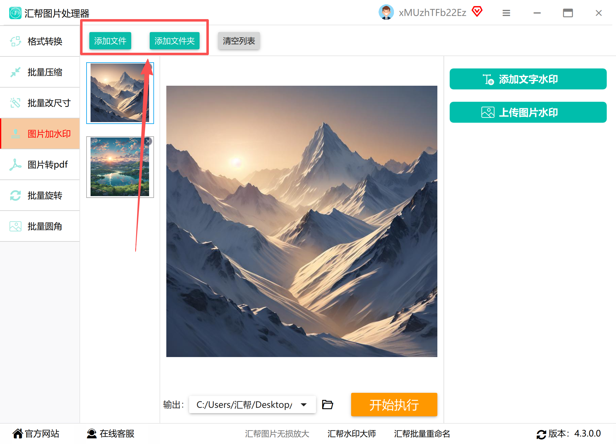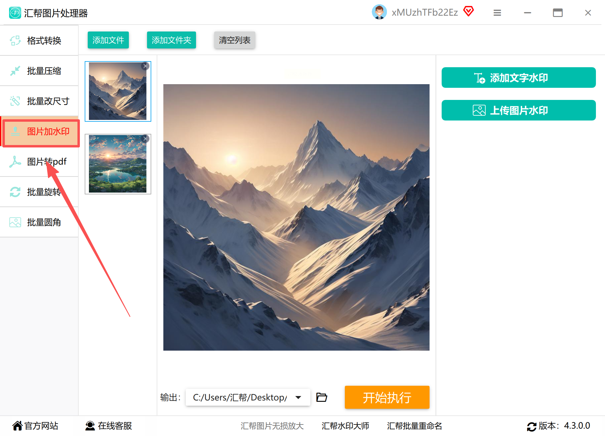 步骤一:启动软件后,在左侧功能导航区点选“图片加水印”模块,这是启用后续步骤的必要前提。