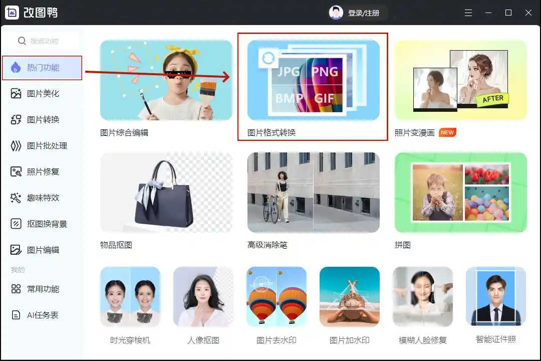 1. 打开改图鸭网站,在首页找到“图片格式转换”功能入口。
