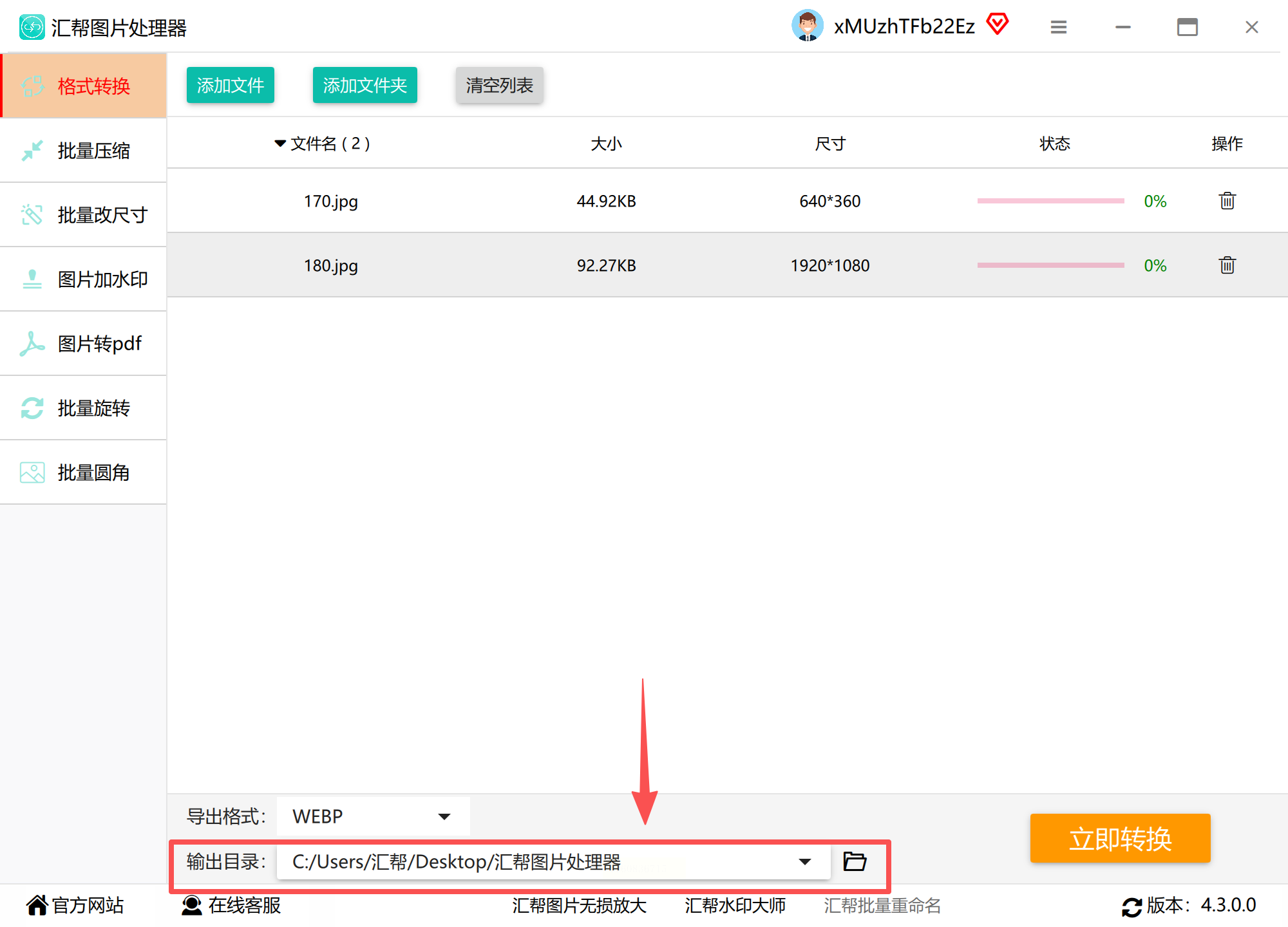 在“格式”下拉菜单中选择“WebP”,同时支持20+格式互转(如PNG、JPEG、BMP等)。