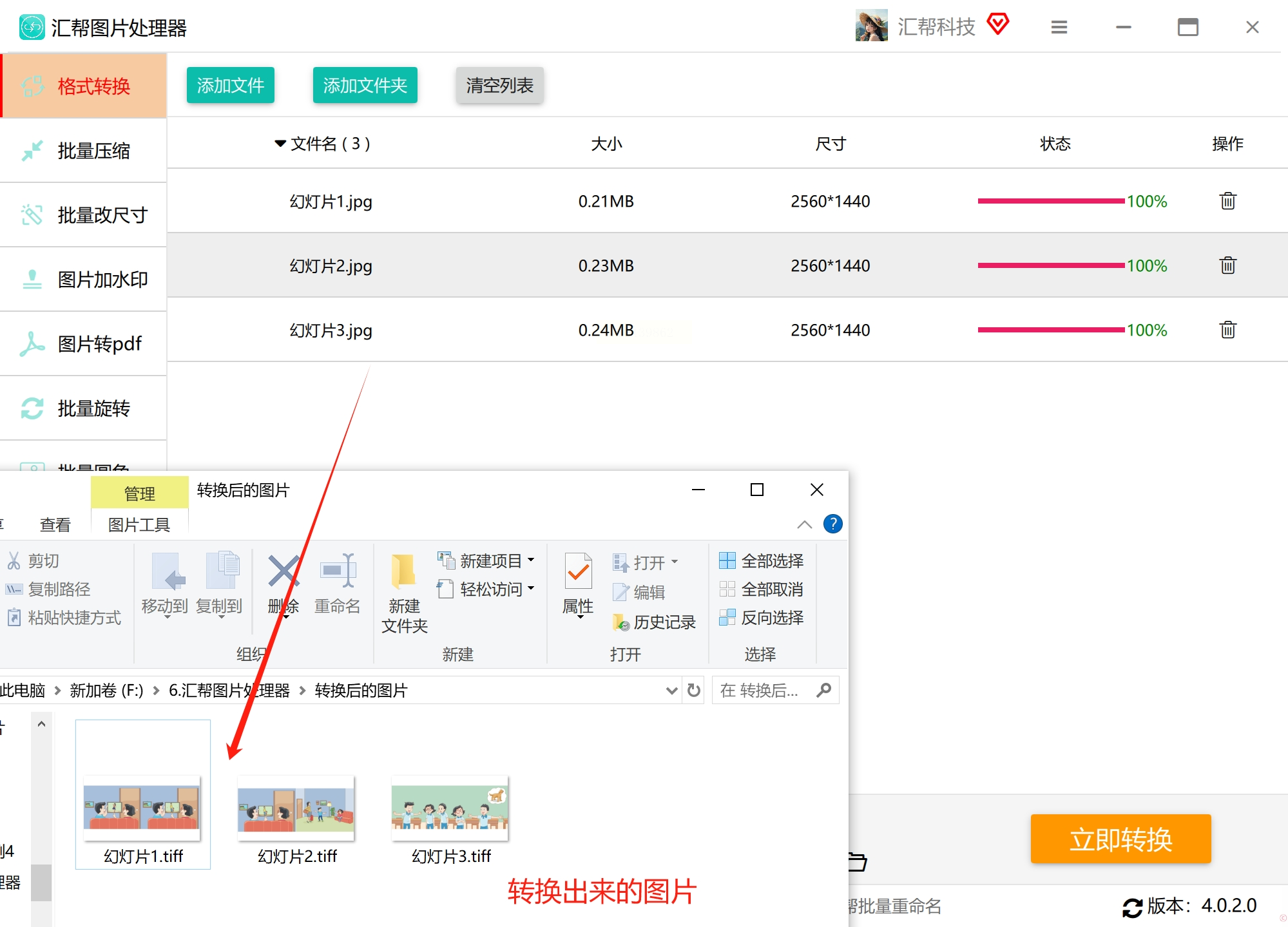 4. 转换完成后,目标文件夹将生成TIFF格式文件