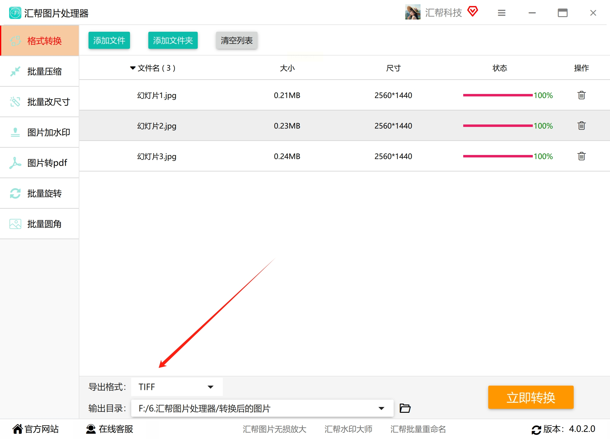 3. 格式配置:在输出格式下拉菜单中选择"TIFF",可进一步设置图像质量参数(压缩率、分辨率)。对于需要高保真的场景,建议选择"无损压缩"模式;若需减小文件体积,可适当提高压缩率。