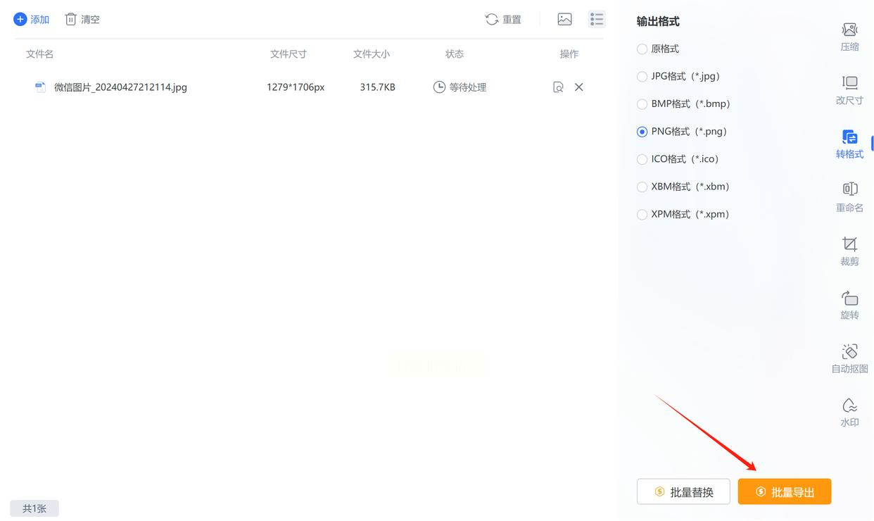 图片添加好后,看软件下方。找到一个叫 “导出格式” 的下拉菜单,点开它,然后在列表里选择 “.PNG”。