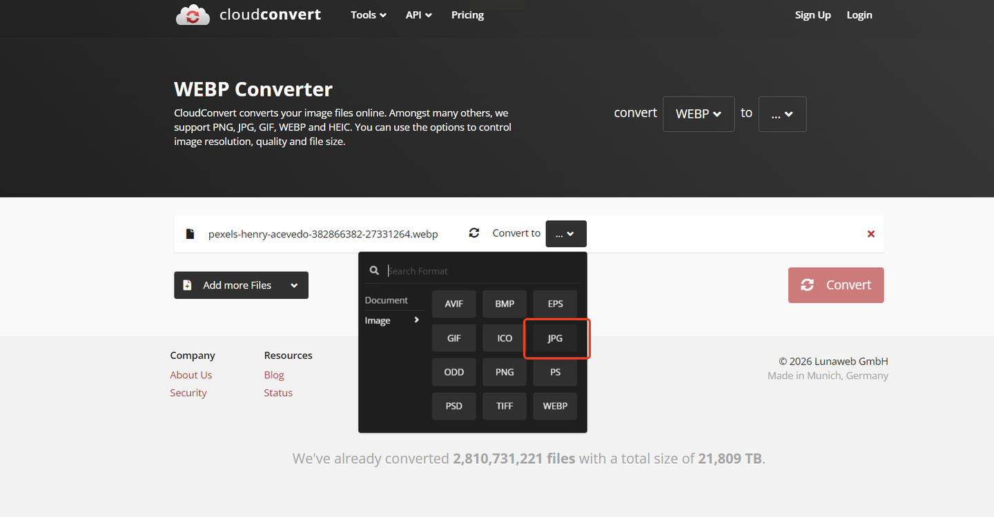1. 打开官网,点击“选择文件”上传WebP图片;