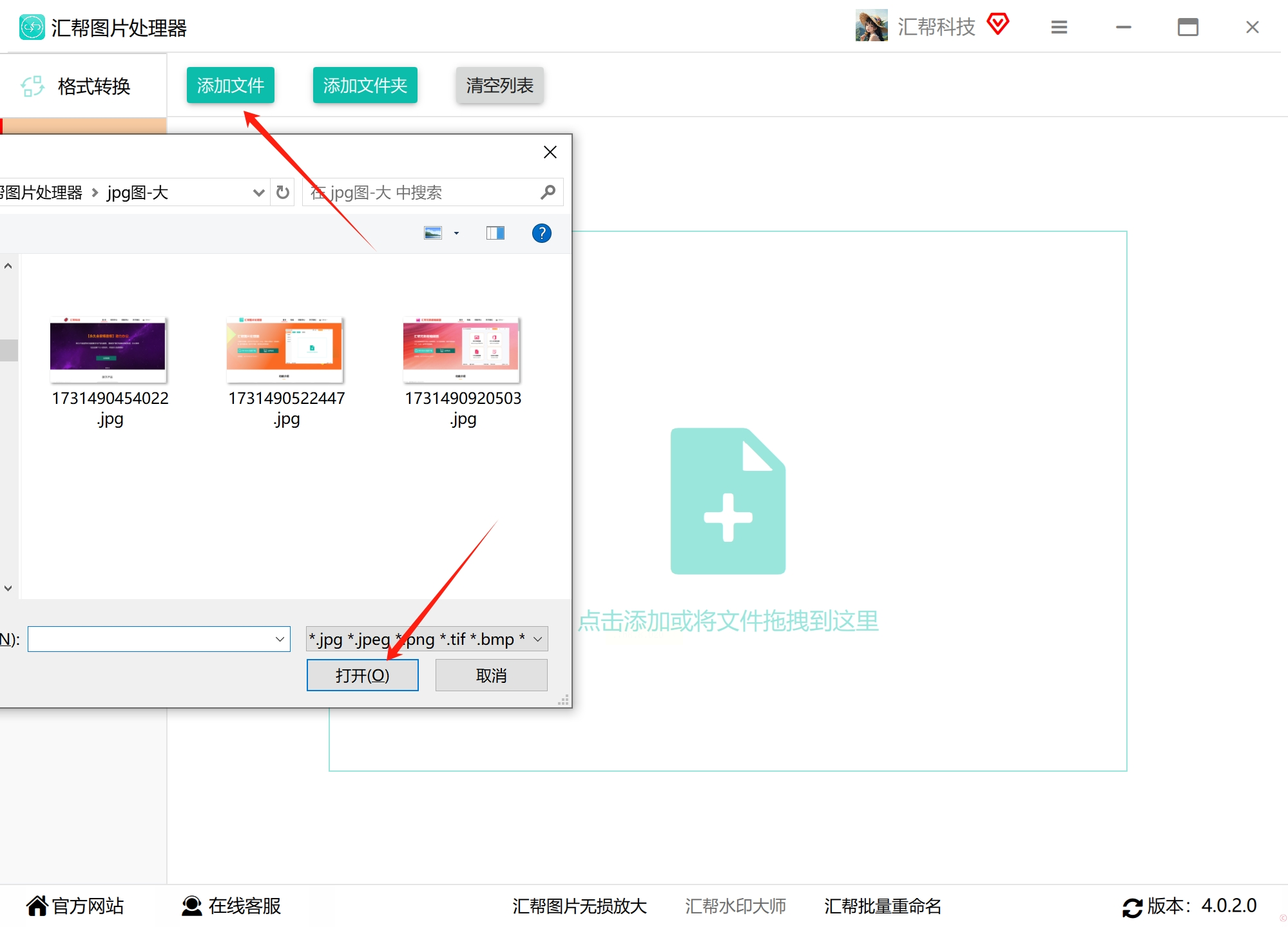 1. 打开在线平台,点击「选择文件」上传JPG图片(支持拖放操作)