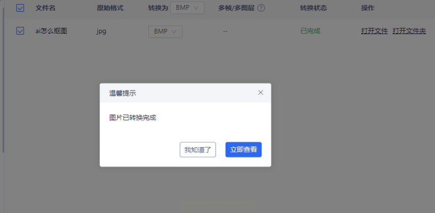 7. 查看结果:转换完成后会弹出提示窗口,点击“打开文件夹”可以直接找到生成的BMP图片。如果没找到,检查下保存路径是否正确。