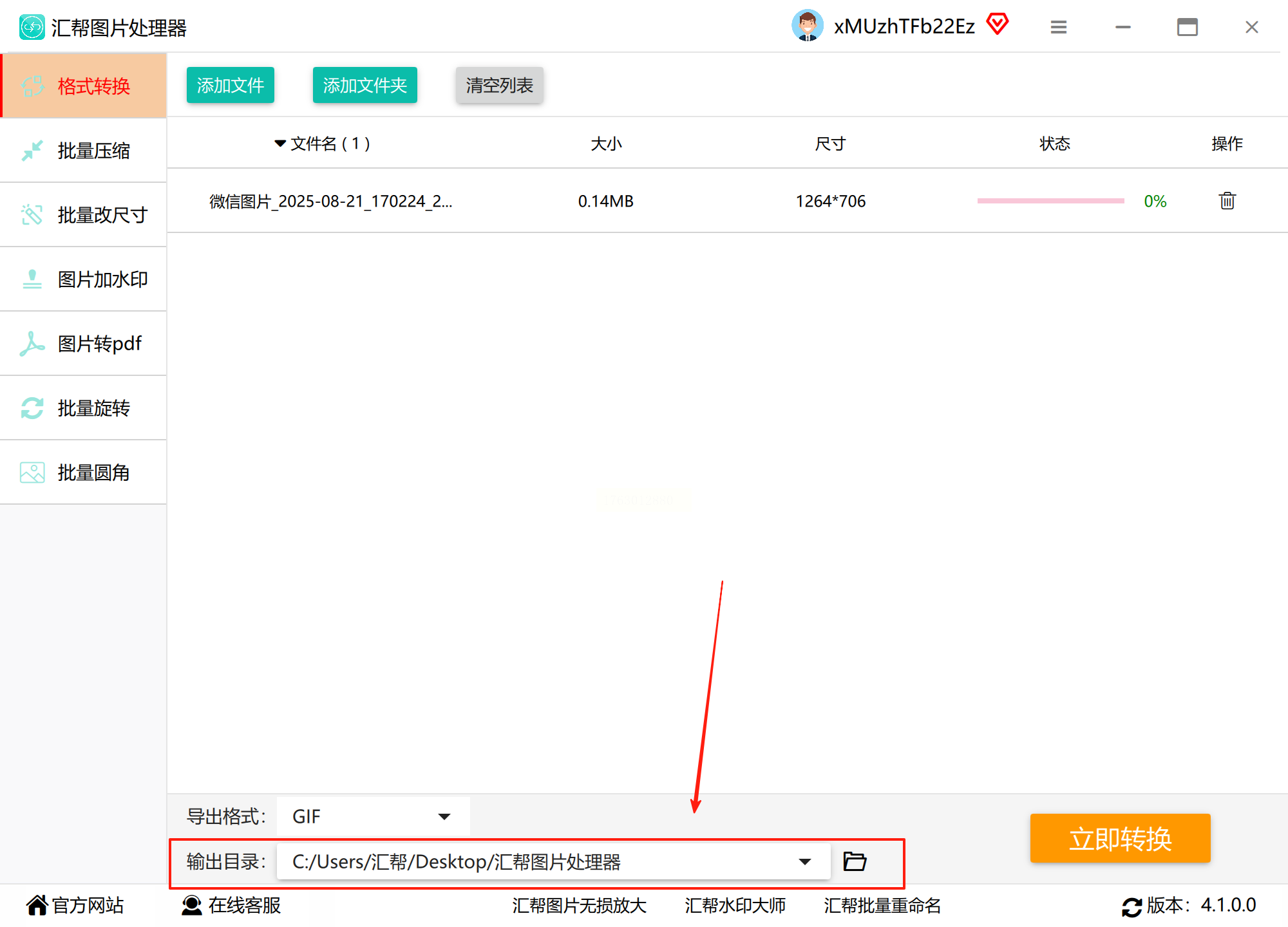 步骤二:在输出设置区域,将目标格式调整为GIF。软件兼容多种常见图片格式,转换过程稳定可靠。
