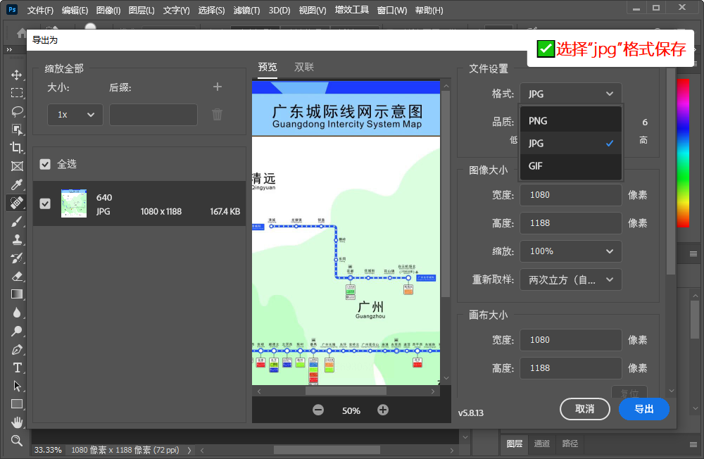 2. 选择导出格式:在格式选项中选择“JPG”,这里还能同时选择其他格式(如PNG、GIF),如果需要转换为其他格式也能灵活切换。