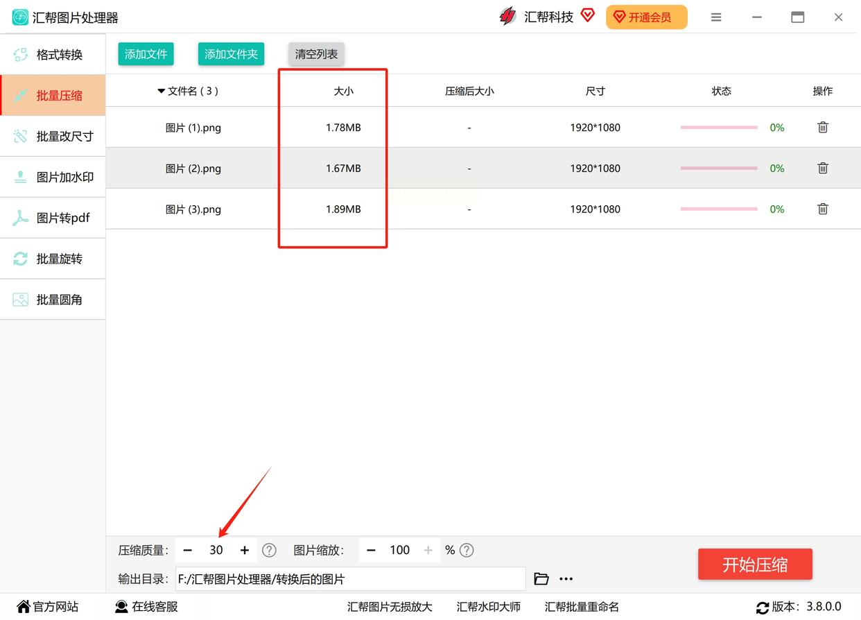 3. 设置参数(关键步骤!):图片导入后,列表里会显示它们原来的大小。现在来到压缩的核心设置部分: