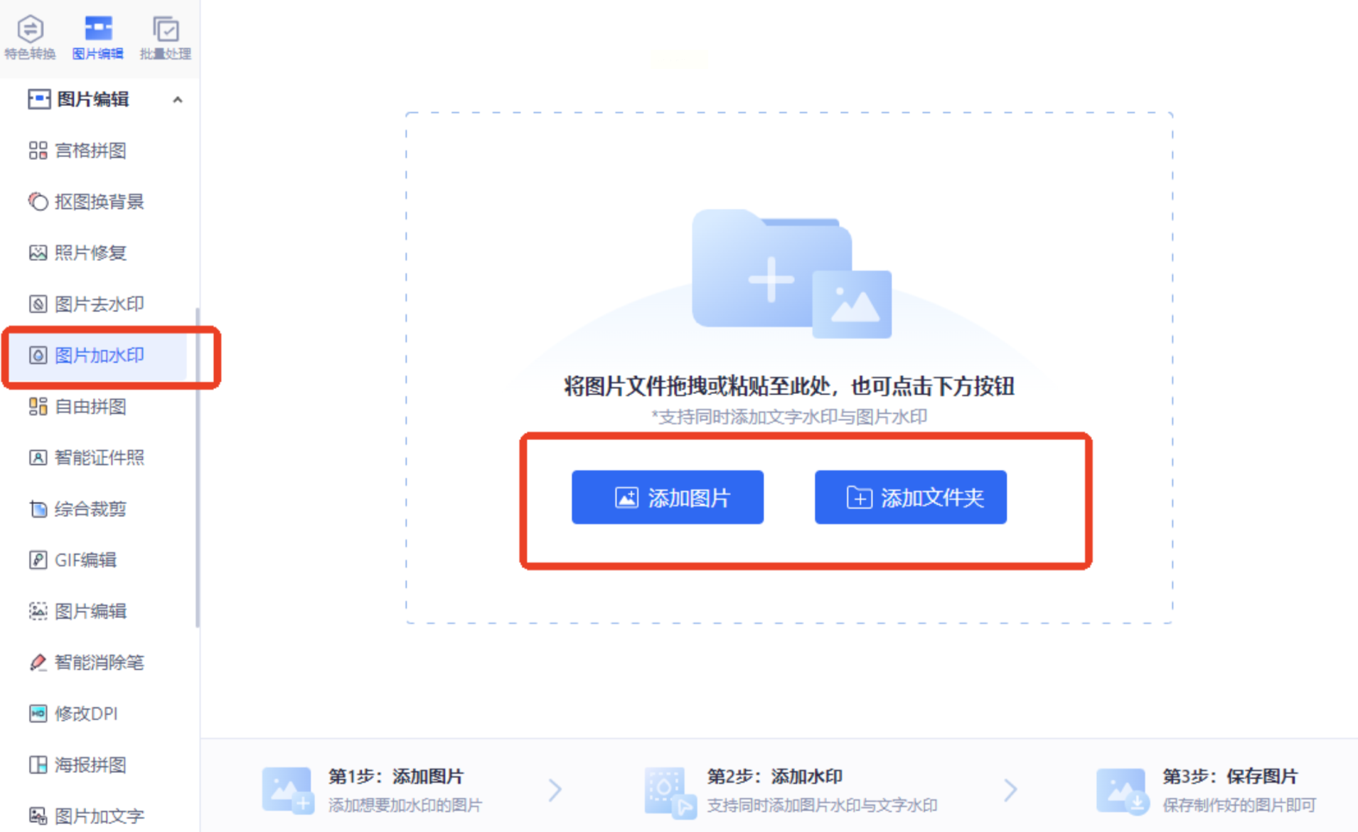 - 启动软件后,在左侧功能栏选择「图片编辑」→「图片加水印」