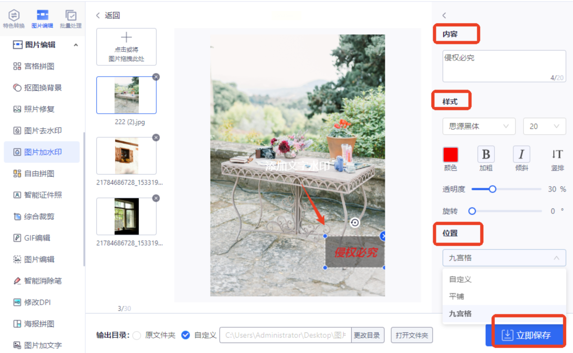 - 点击右侧「添加文字水印」按钮,在弹出的编辑框中输入水印内容(如"版权所有:XXX工作室")