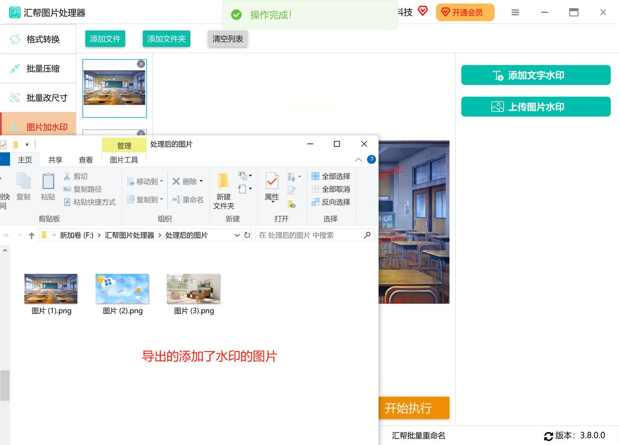 - 处理完成后会弹出提示窗口,点击"打开文件夹"即可查看生成的水印图片
