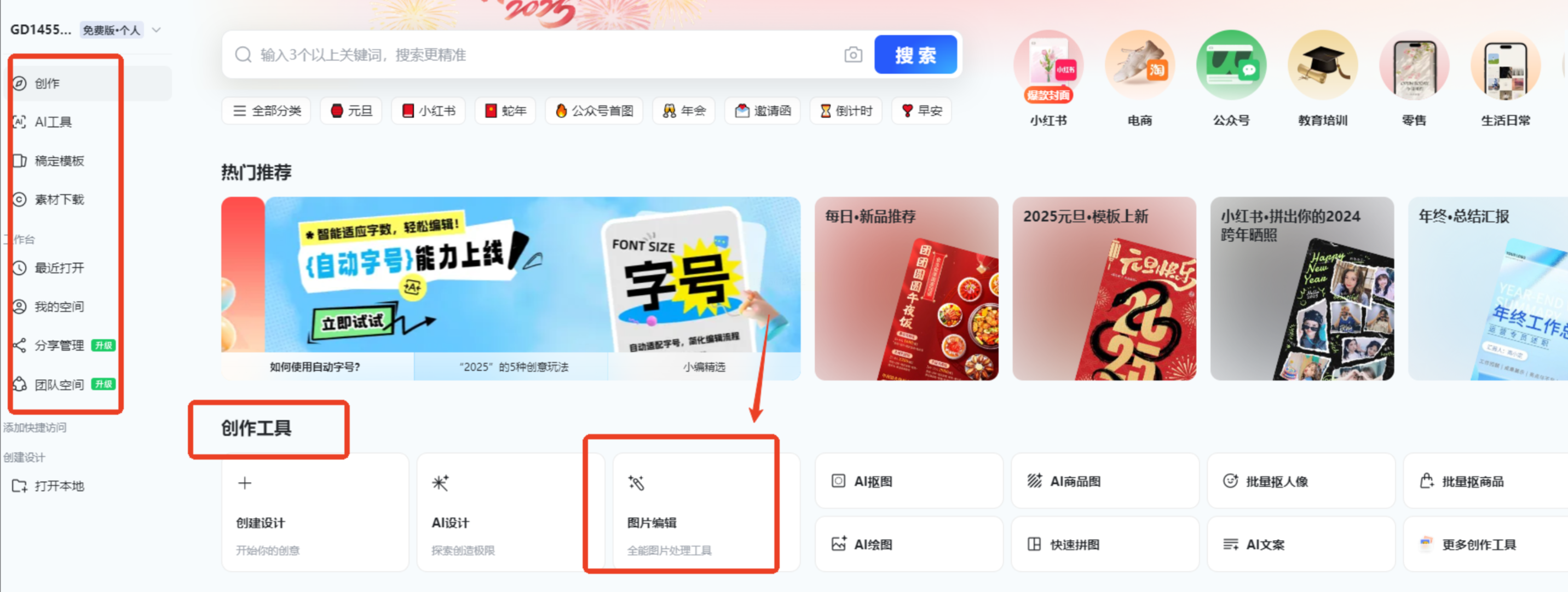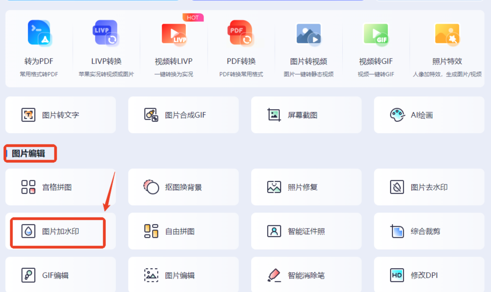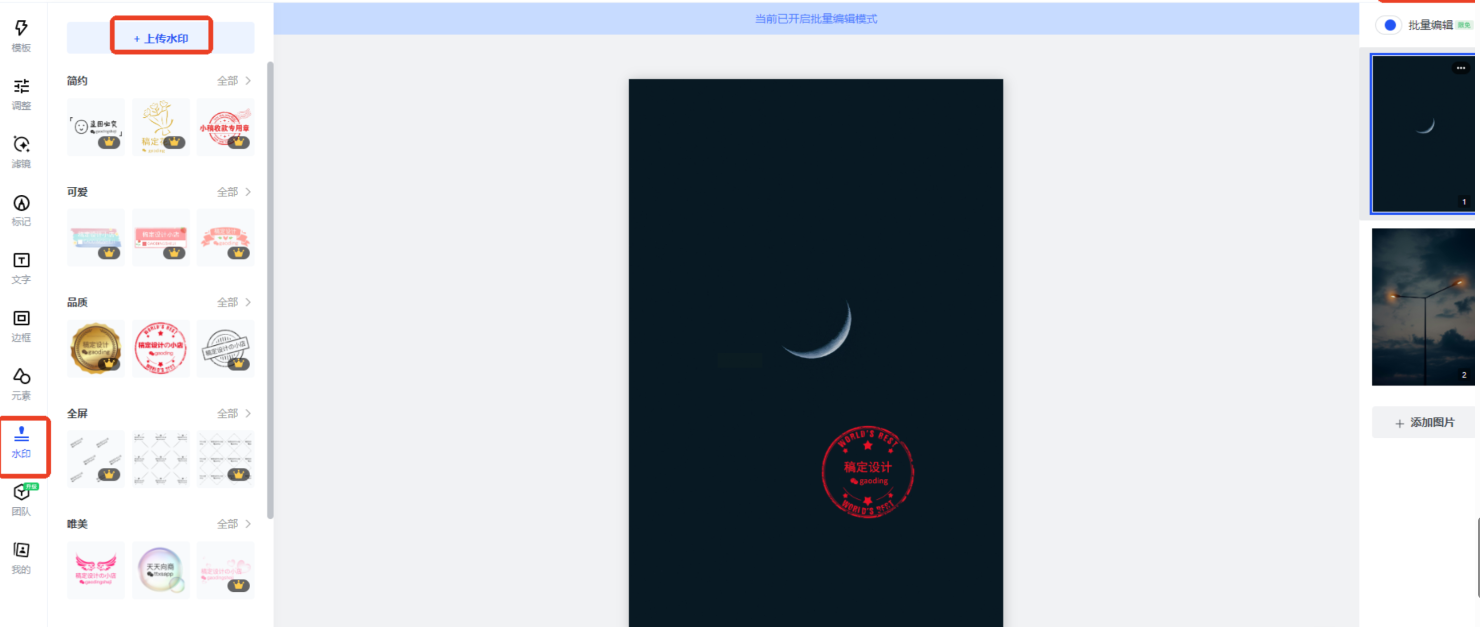 - 在首页「设计工具」中选择「图片编辑」→「批量加水印」