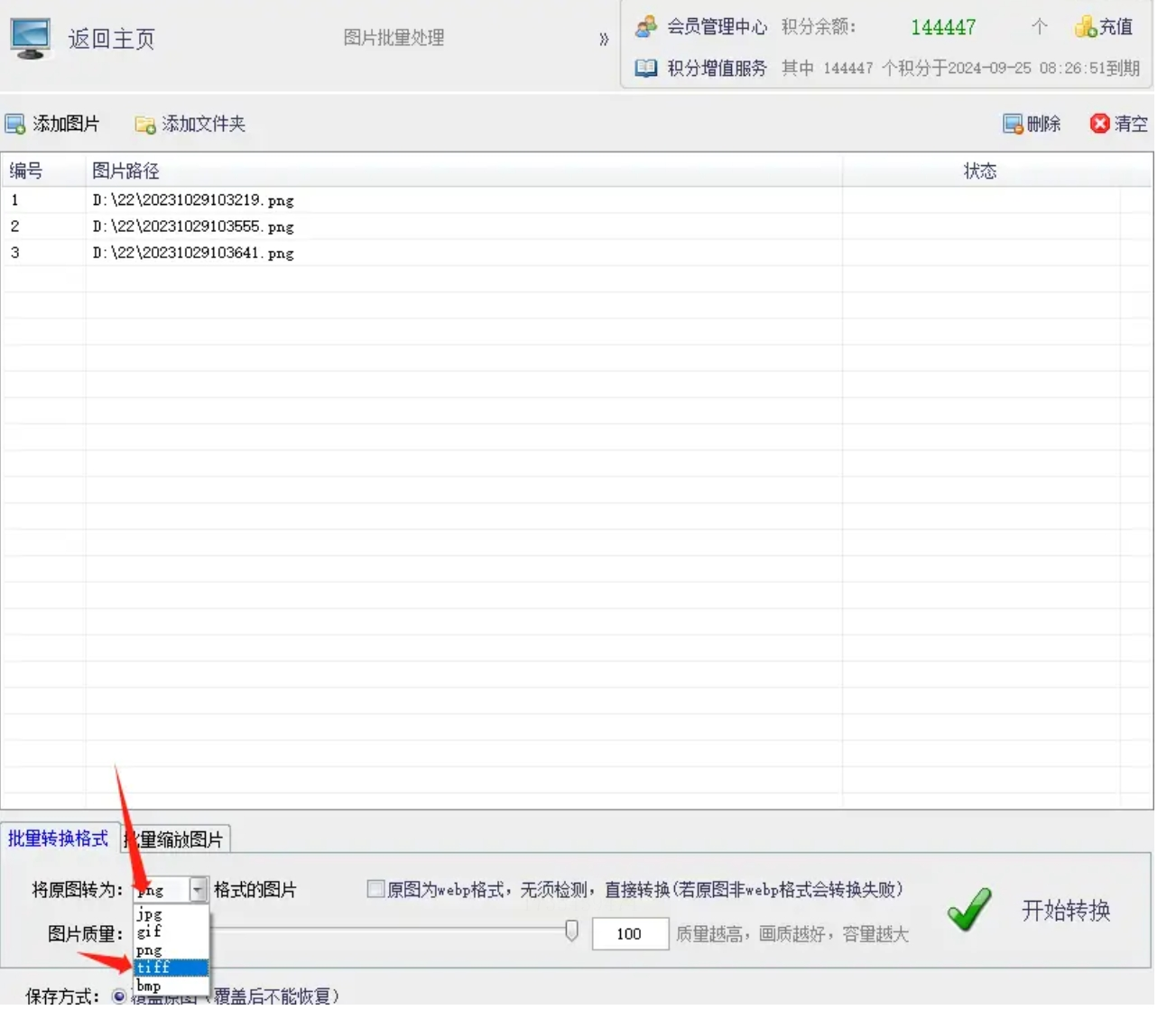 3. 在"批量转换格式"那里选择TIFF格式