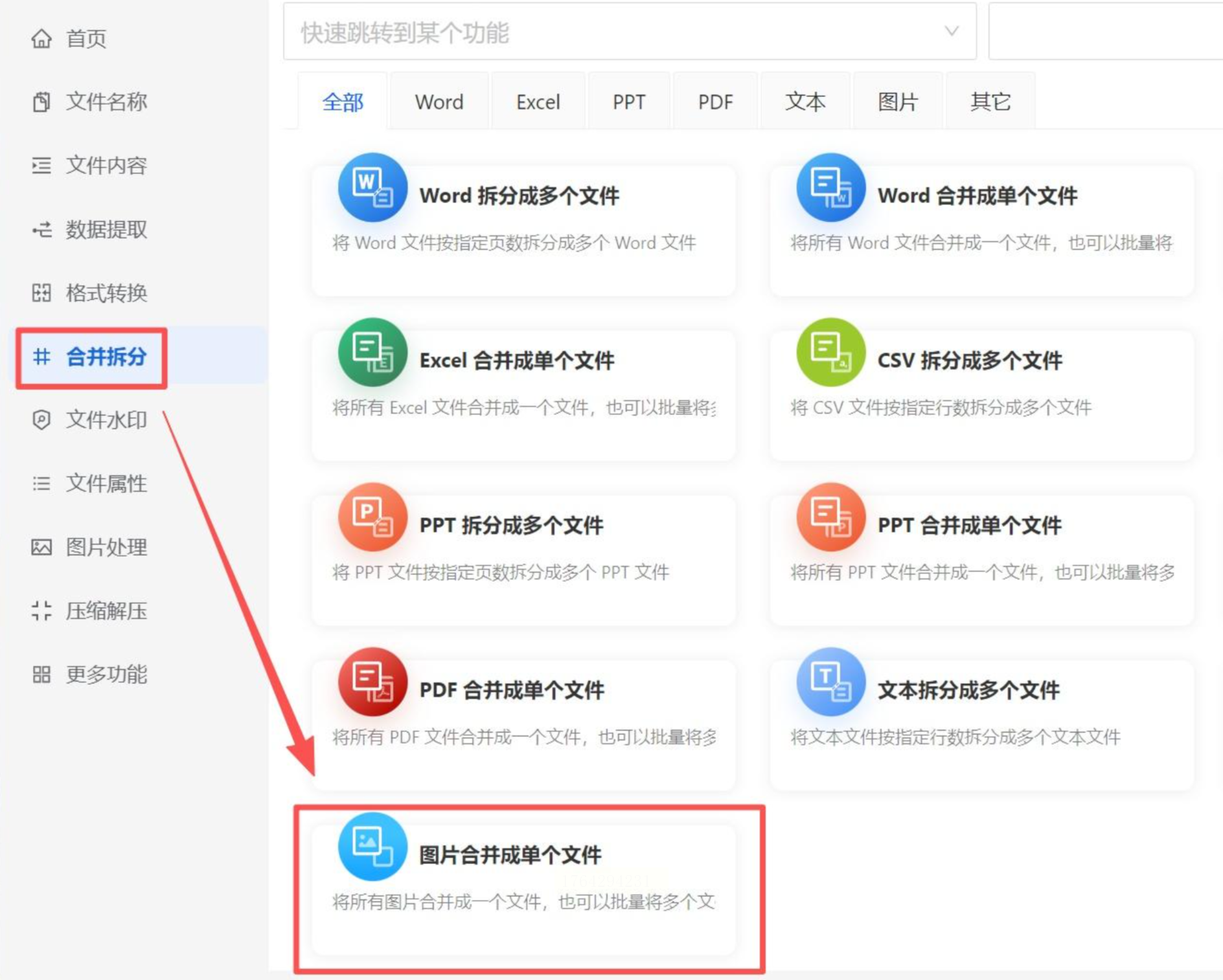 1. 打开工具箱:选「合并拆分」→「图片合并成单个文件」