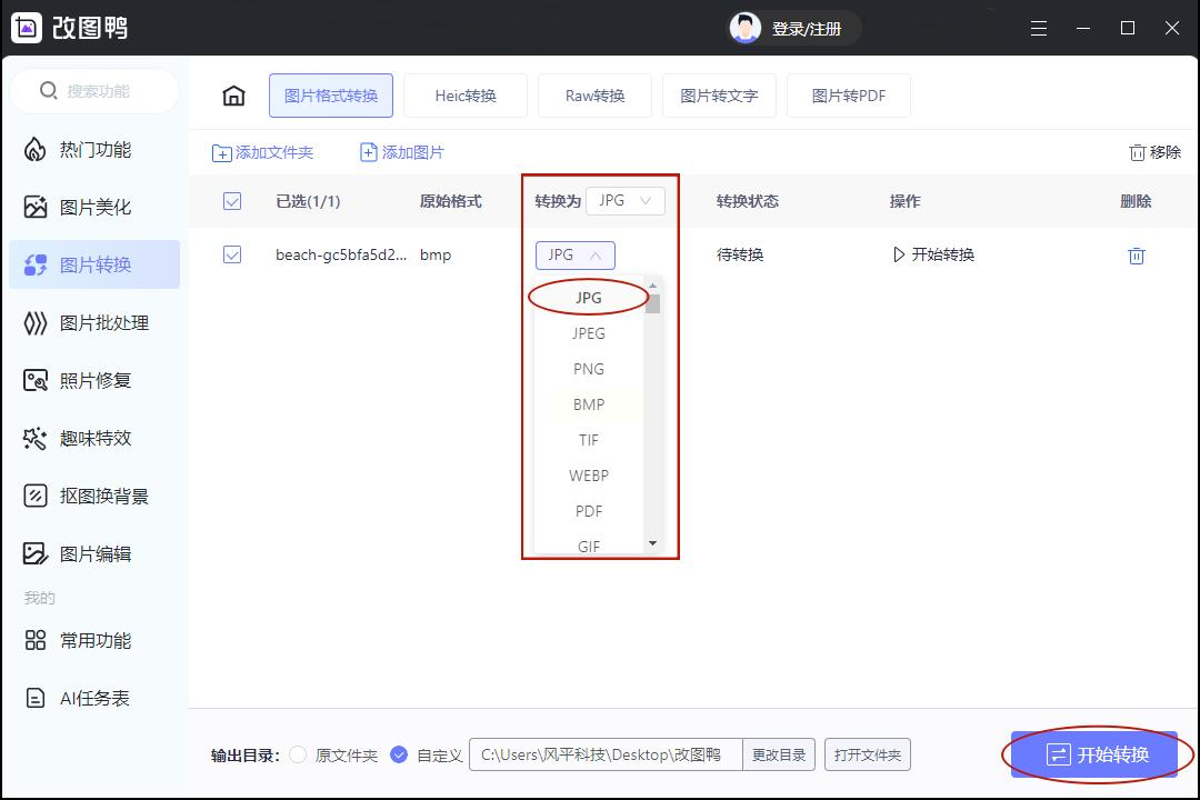 设置完成后点击“开始转换”,系统会快速处理图片。转换完成后,点击“下载”按钮保存JPG文件。改图鸭支持多格式转换,且操作界面简洁,适合快速处理。