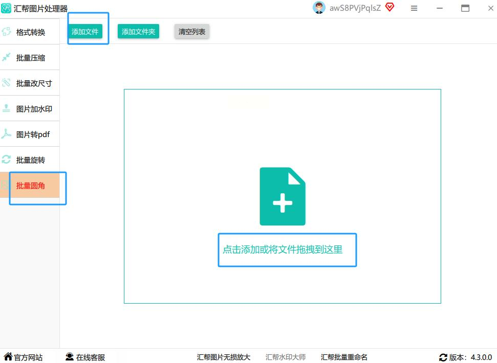 先打开汇帮图片处理器,界面很清爽,左边是功能选项,你直接在里面找【批量圆角】这个按钮,点一下就行。界面会分成左右两部分,左边是功能区,右边是图片处理区,很直观。