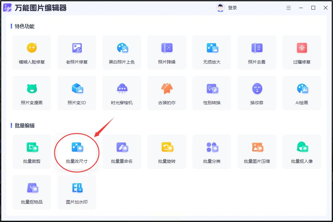 下载安装后打开,你会看到它可能按图片类型分了区,比如“人像”、“物品”、“通用”等。其实对于改尺寸,选哪个区都行,或者直接找“批量工具”入口。进入后,选择“批量修改尺寸”功能。