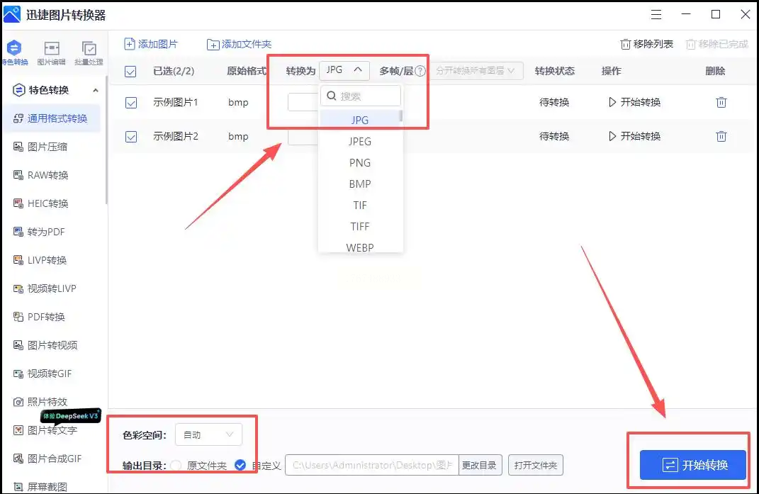 针对批量转换需求,迅捷图片转换器提供了高效解决方案。其“通用格式转换”模块支持一次性导入多张图片,适合处理几十张甚至上百张BMP图片。