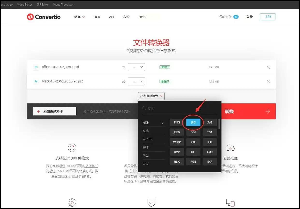 步骤三,图片添加成功后,在页面上方找到一个“转换格式”的选项。点击它,从弹出的列表里选择“JPG”格式。