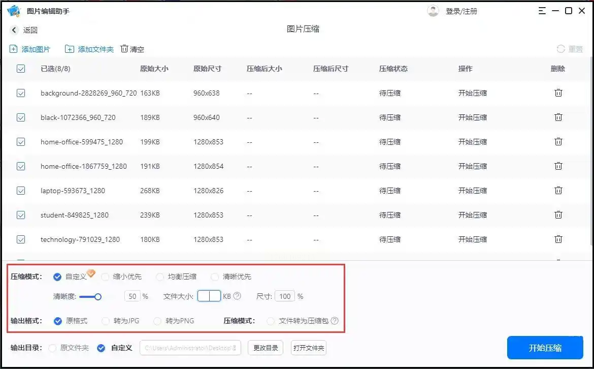 步骤三:在图片列表下方,展开压缩设置。通常提供“高效压缩”、“普通压缩”等模式。你也可以选择“自定义”模式,手动设置压缩强度、分辨率等具体参数。