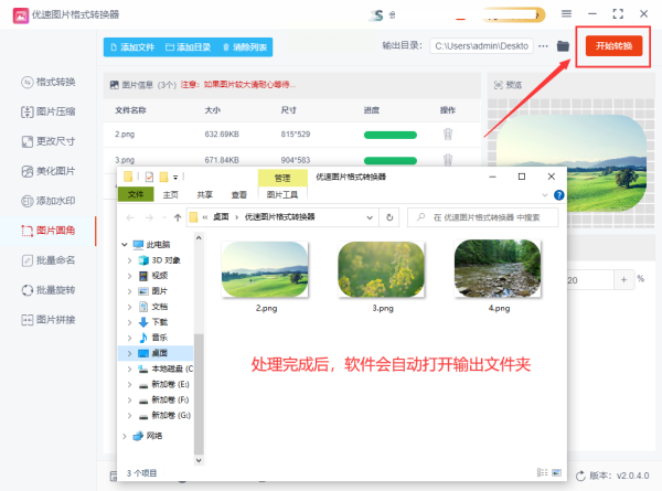* 步骤四:感觉效果可以了,就点击“开始转换”按钮。处理完成后,软件通常会自动打开输出文件夹,方便你立刻查看生成好的圆角图片。