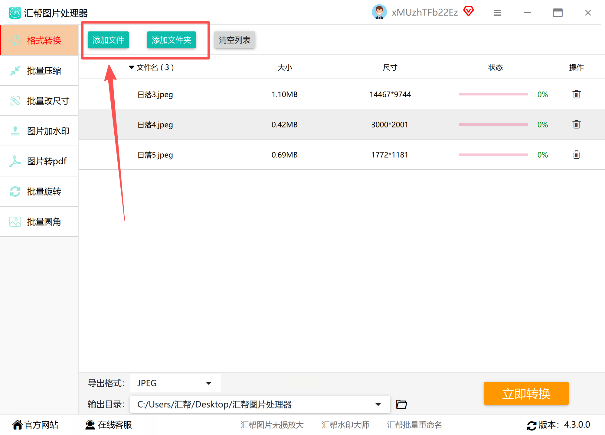 2. 点击左上角"添加文件",可批量导入JPEG图片。也支持将图片文件直接拖拽到软件界面。