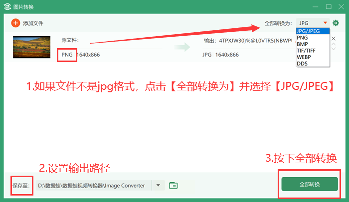 3. 软件会自动识别图片格式,若不是JPG格式,点击"全部转换为"下拉菜单选择"JPG/JPEG"。