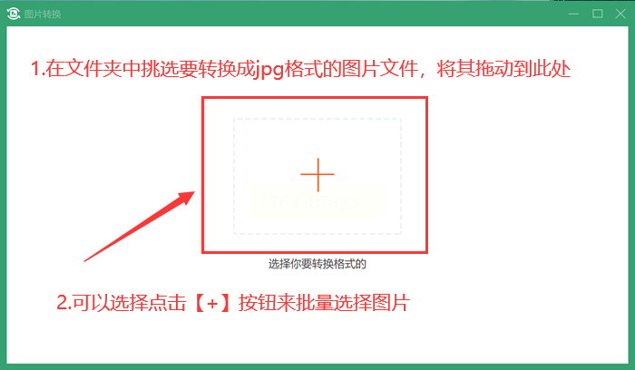 2. 点击界面中的"+"按钮,批量选择需要转换的JPEG图片。或直接将图片拖放至软件指定区域。
