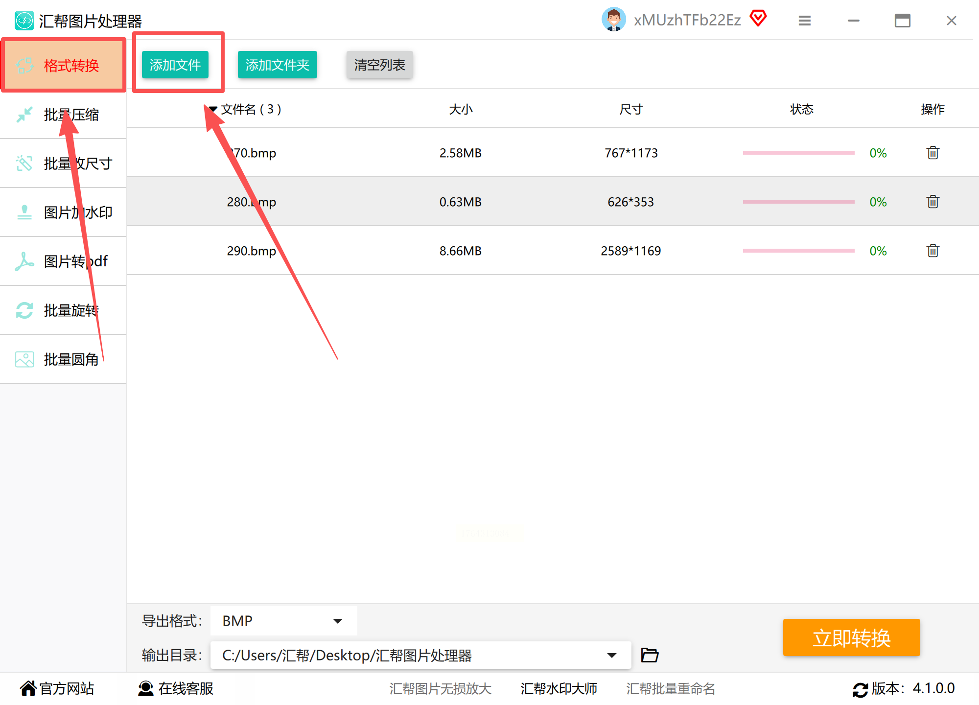 - 步骤一:启动软件后,点击左上角“添加文件”按钮,批量导入BMP文件(支持JPG/PNG等格式同时导入)