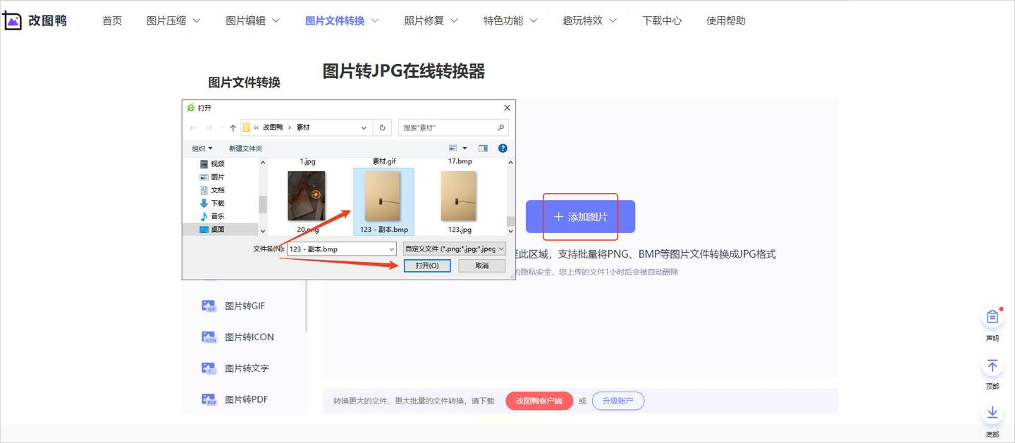 步骤二:点击上传区域,从电脑中选择要转换的BMP图片。