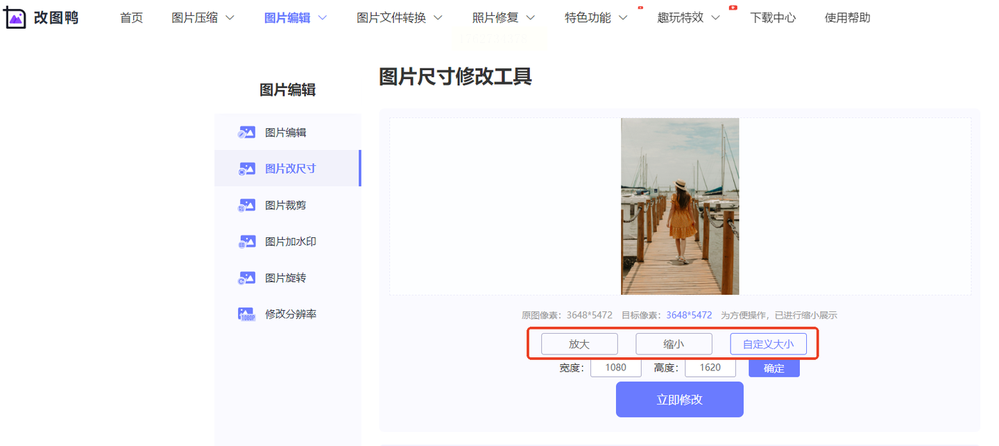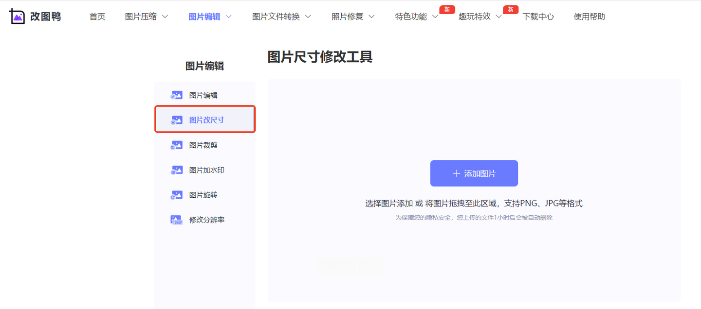2. 选择功能:点击“图片改尺寸”分类,进入对应页面。