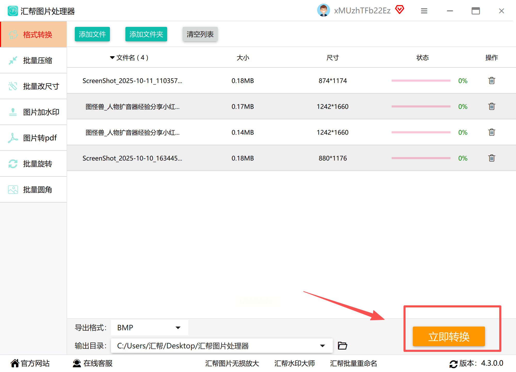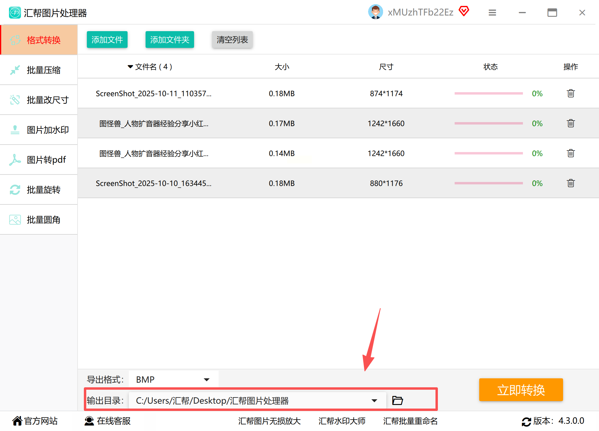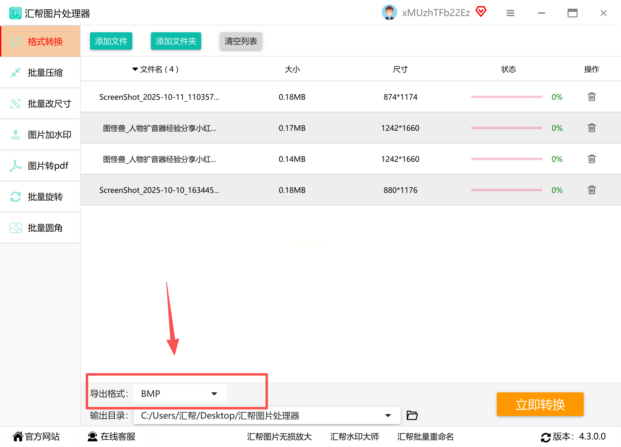 2. 格式设置:在「输出格式」下拉菜单中选择「BMP」,软件同时支持PNG、TIFF等20+格式互转,满足多样化需求;