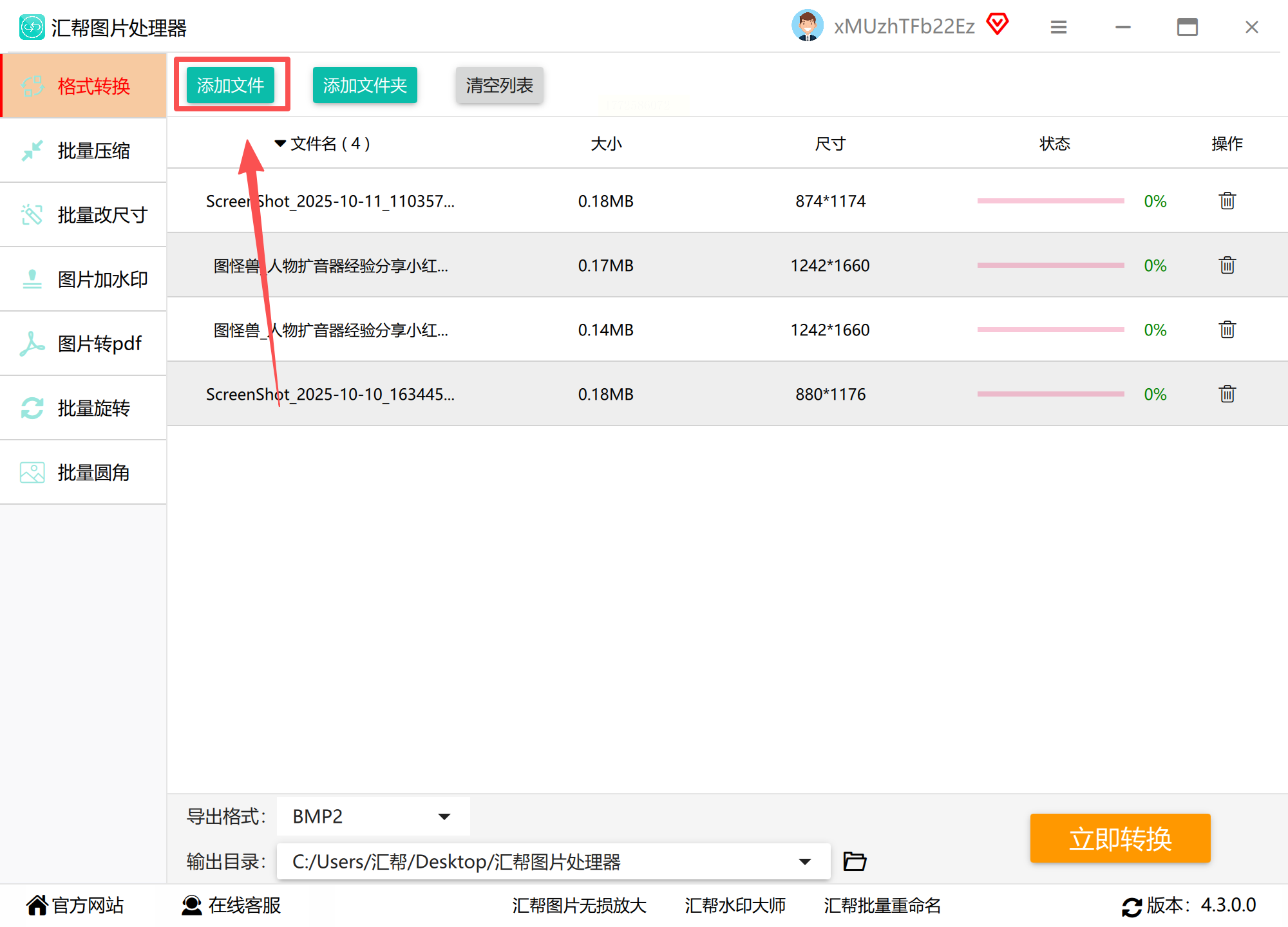 1. 添加文件:打开软件后,点击「添加文件」按钮,可通过Ctrl+点击多选或直接拖拽JPG文件到列表;