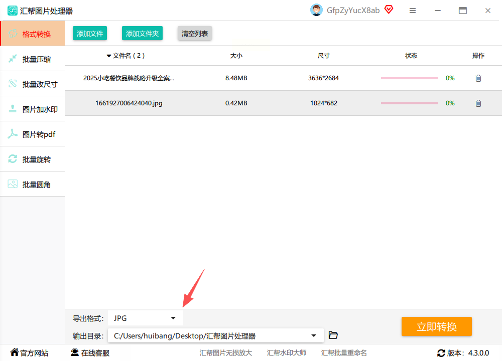 1. 打开汇帮图片处理器,在左侧功能栏选择“格式转换”选项。