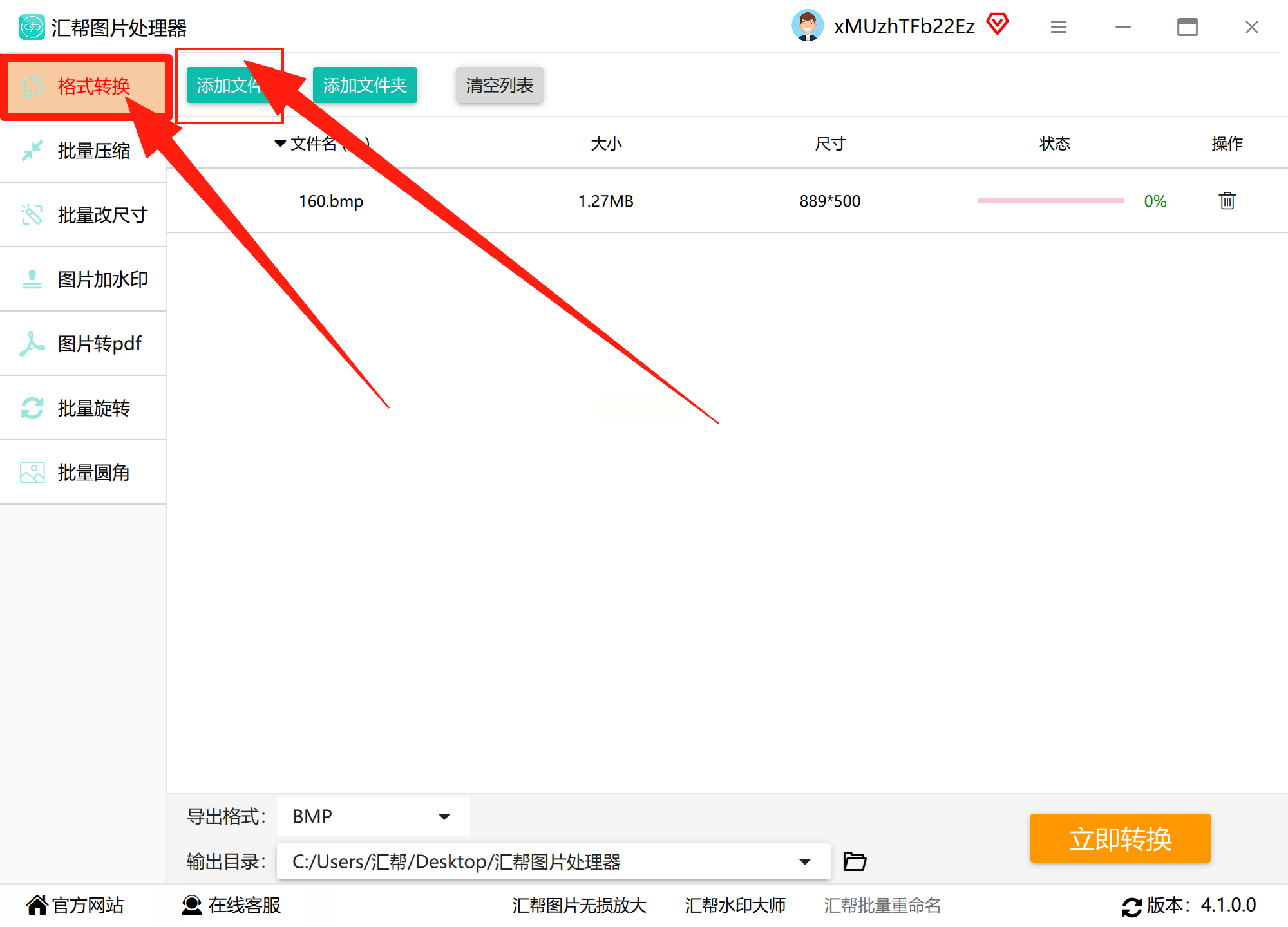 2. 导入图片:点击“添加文件”按钮,选中要转换的BMP文件(支持批量拖放,我一次传了20张图,超方便)