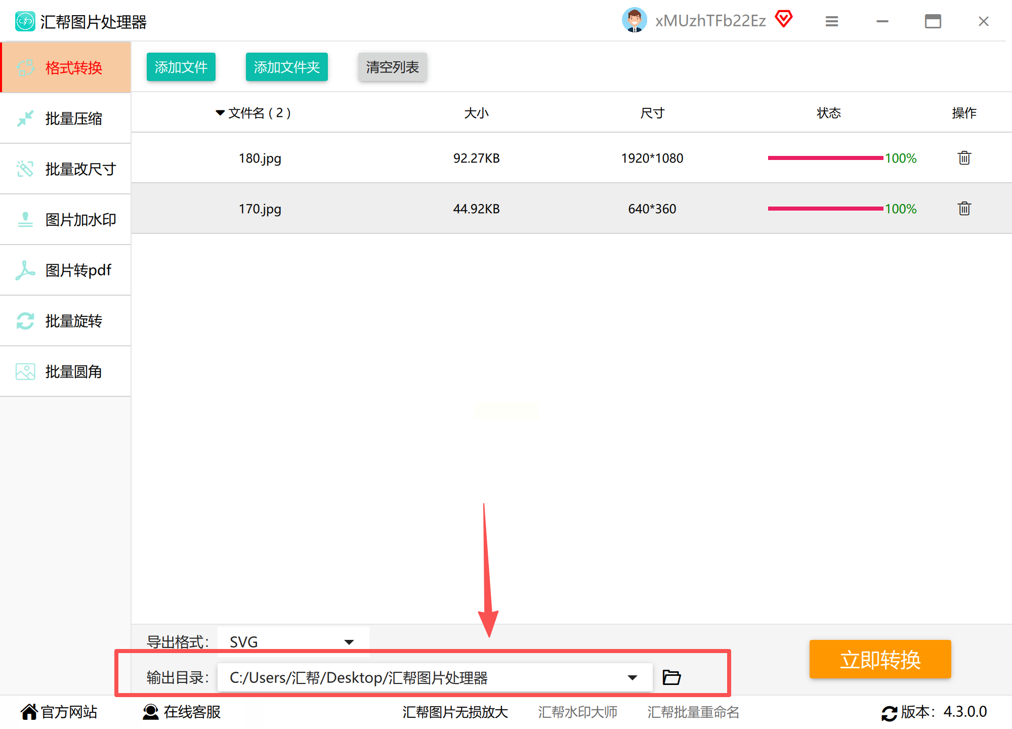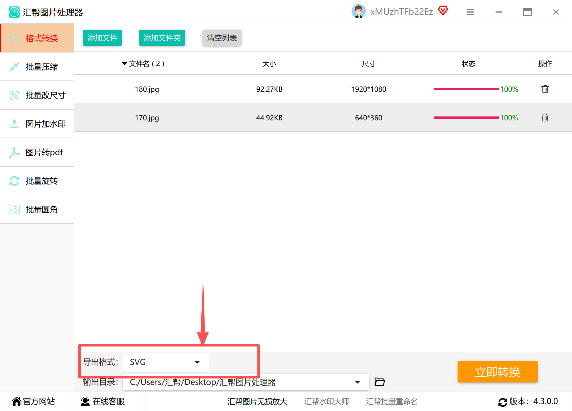 2. 格式选择:在输出格式下拉菜单中选择"SVG",可同时勾选"批量转换"(支持多张JPG同时处理)。