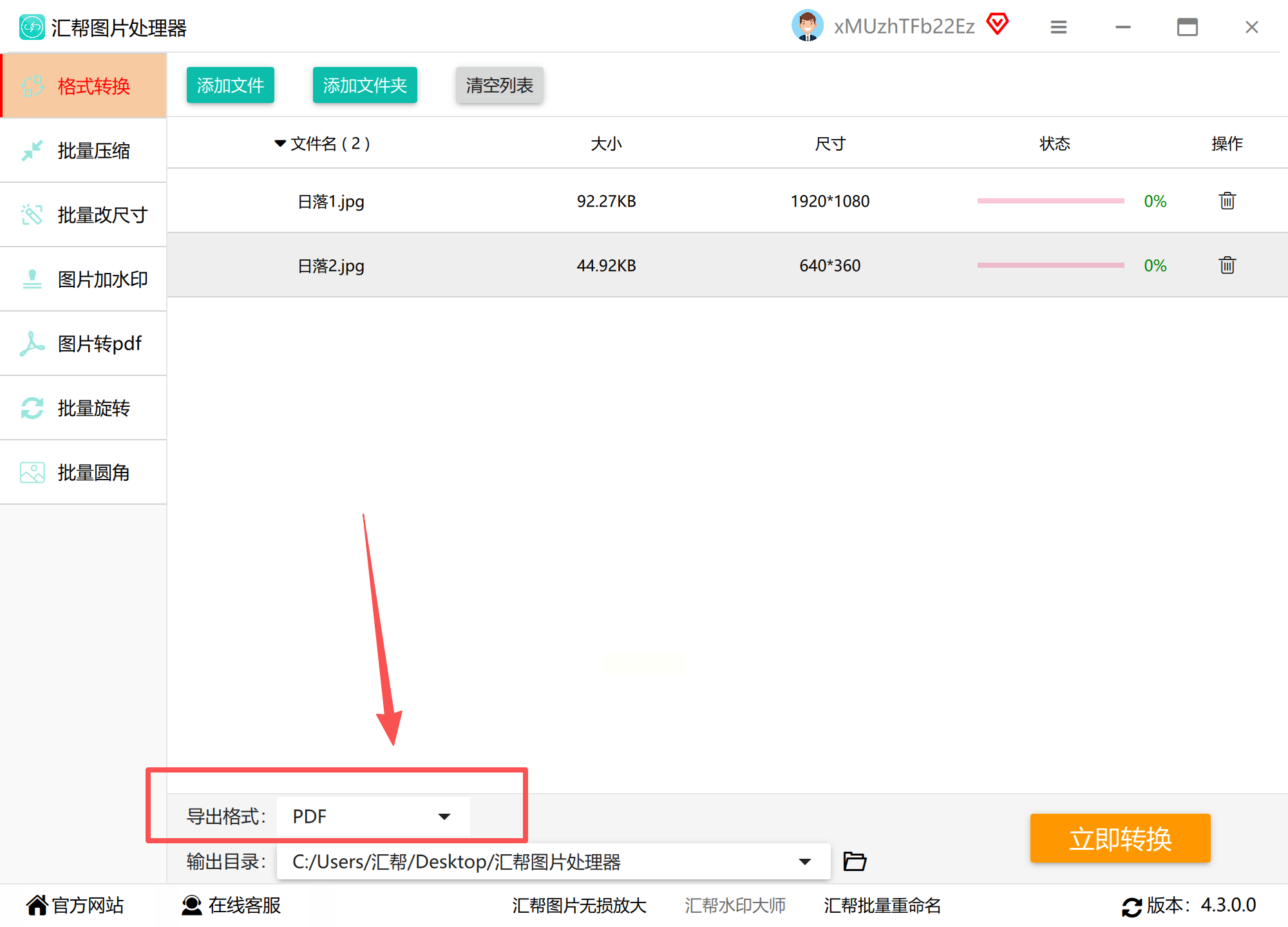 - 步骤二:在格式设置区,你会看到丰富的输出选项。选择"PDF"格式后,还能根据需求调整页面大小(比如A4、A3)、图片分辨率(默认300dpi足够打印使用),甚至可以设置图片的排列方式(横向或纵向排列)。
