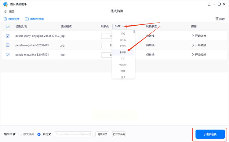 所有图片以缩略图形式显示后,在右侧设置面板找到“输出格式”,从下拉菜单里选择“BMP”。其他参数如尺寸调整、重命名等可以根据需要设置。最后点击右下角的“开始转换”按钮。