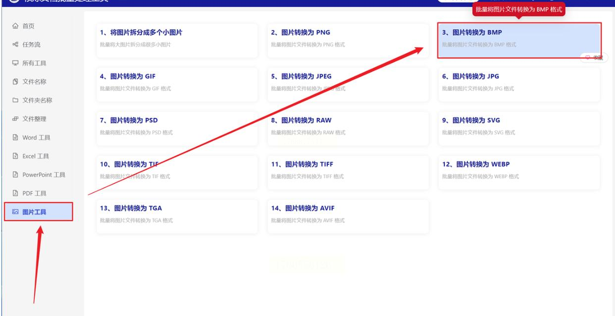 运行软件后,主界面像是一个功能仪表盘。找到“图片工具”分类标签,点击展开子菜单。在列表中选择“图片转换为BMP”功能项,系统会跳转到专用转换界面。