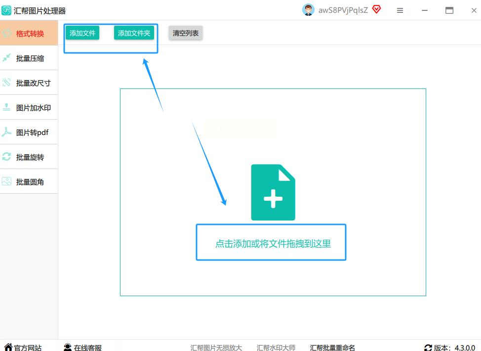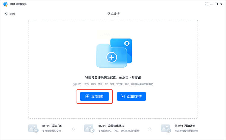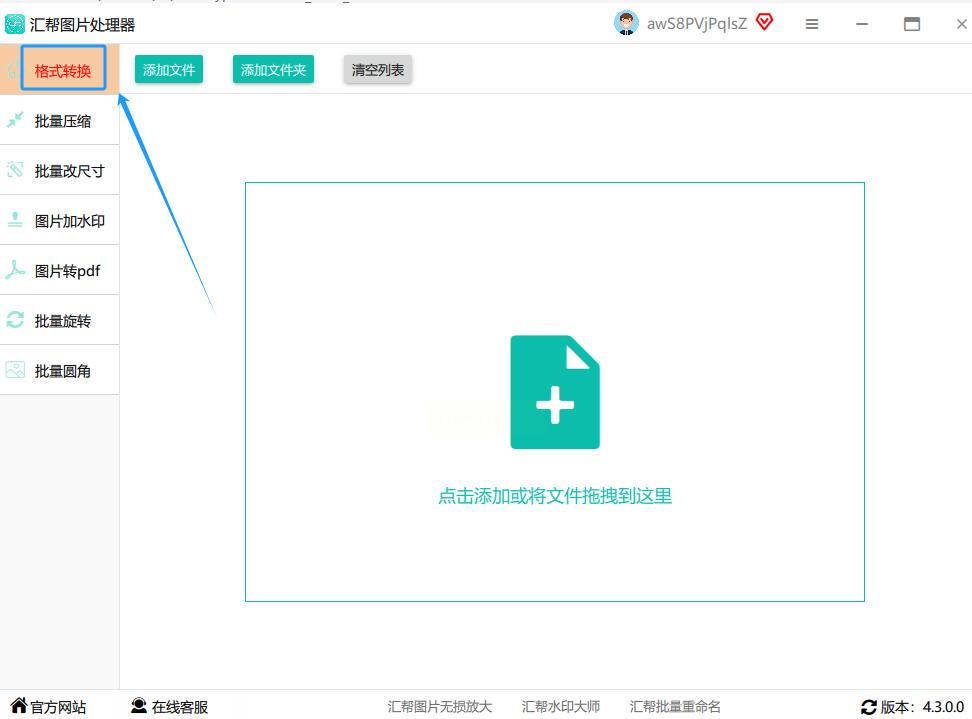 启动软件后,在主界面找到“格式转换”功能模块,点击进入。你会看到一个简洁的拖放区域,上面写着“添加图片或拖拽文件到这里”。