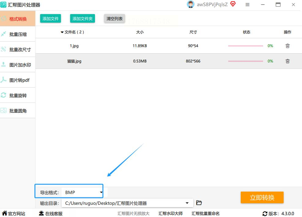 图片添加好后,把视线移到界面下方。那里有个“导出格式”的下拉菜单,点开它,在一堆格式名称里找到“BMP”,单击选中。