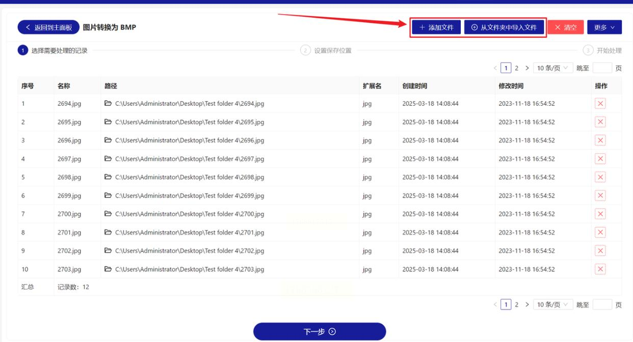界面顶部有两个导入选项:点击“添加文件”可以手动选择单个或多个JPG;如果你要把整个文件夹的图片都转换,就用“从文件夹中导入文件”功能,指定文件夹路径后,软件会自动扫描里面的所有图片文件。