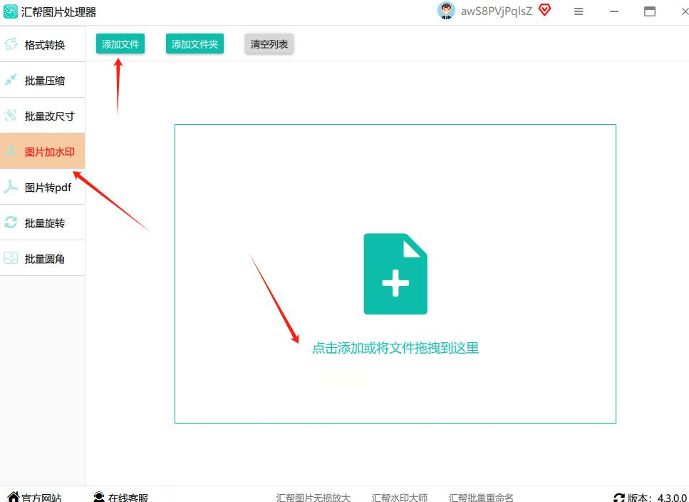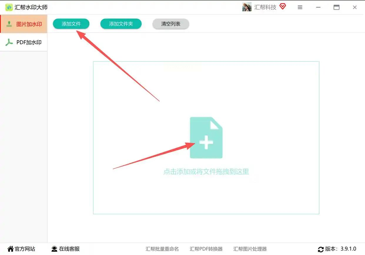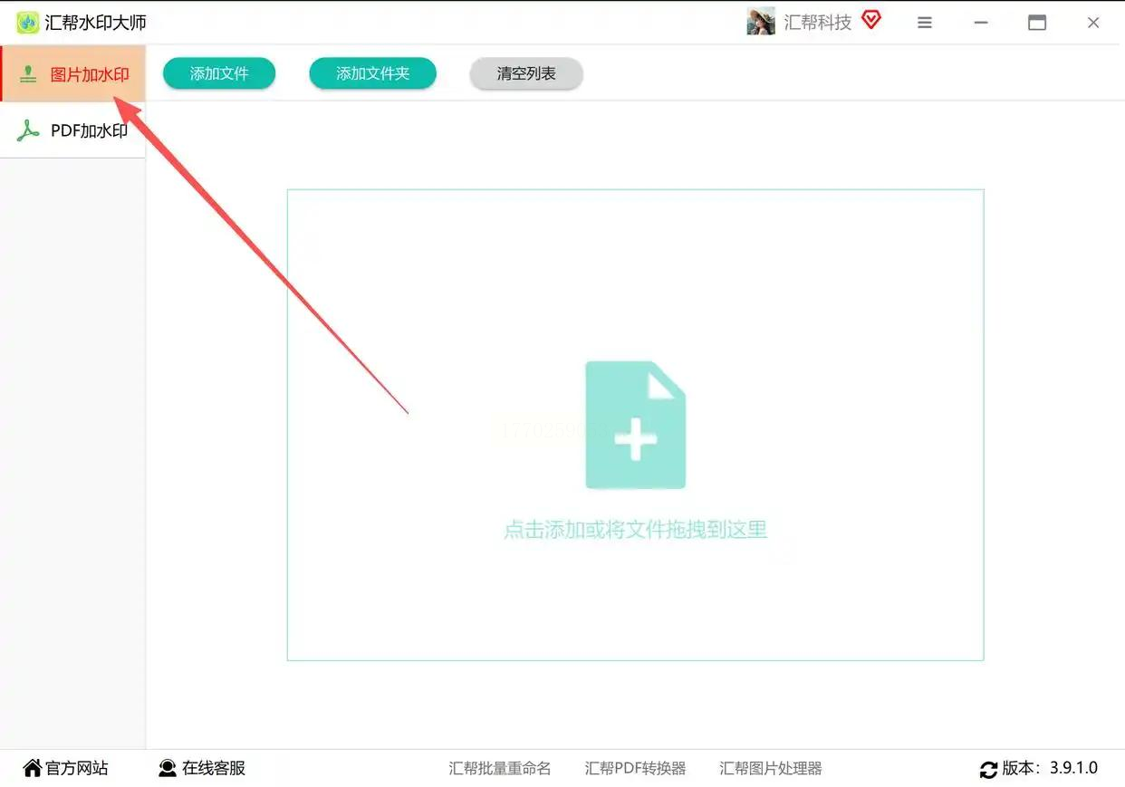 先启动汇帮图片处理器,在主界面找到“图片加水印”这个按钮(就在最显眼的位置,一眼就能看到),点进去!