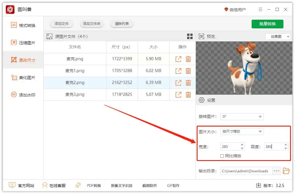 步骤二:设置参数:勾选"按尺寸缩放",输入宽高数值(如500×500),支持设置最小尺寸防止图片过小。若需保持透明背景,选择PNG格式导出。