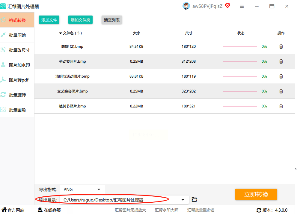 上方菜单栏找到“输出格式”下拉框,选“PNG”就行!如果要给转换后的图片换个保存位置,点左下角“输出目录”旁边的“浏览”,选个文件夹存转换后的PNG图片。