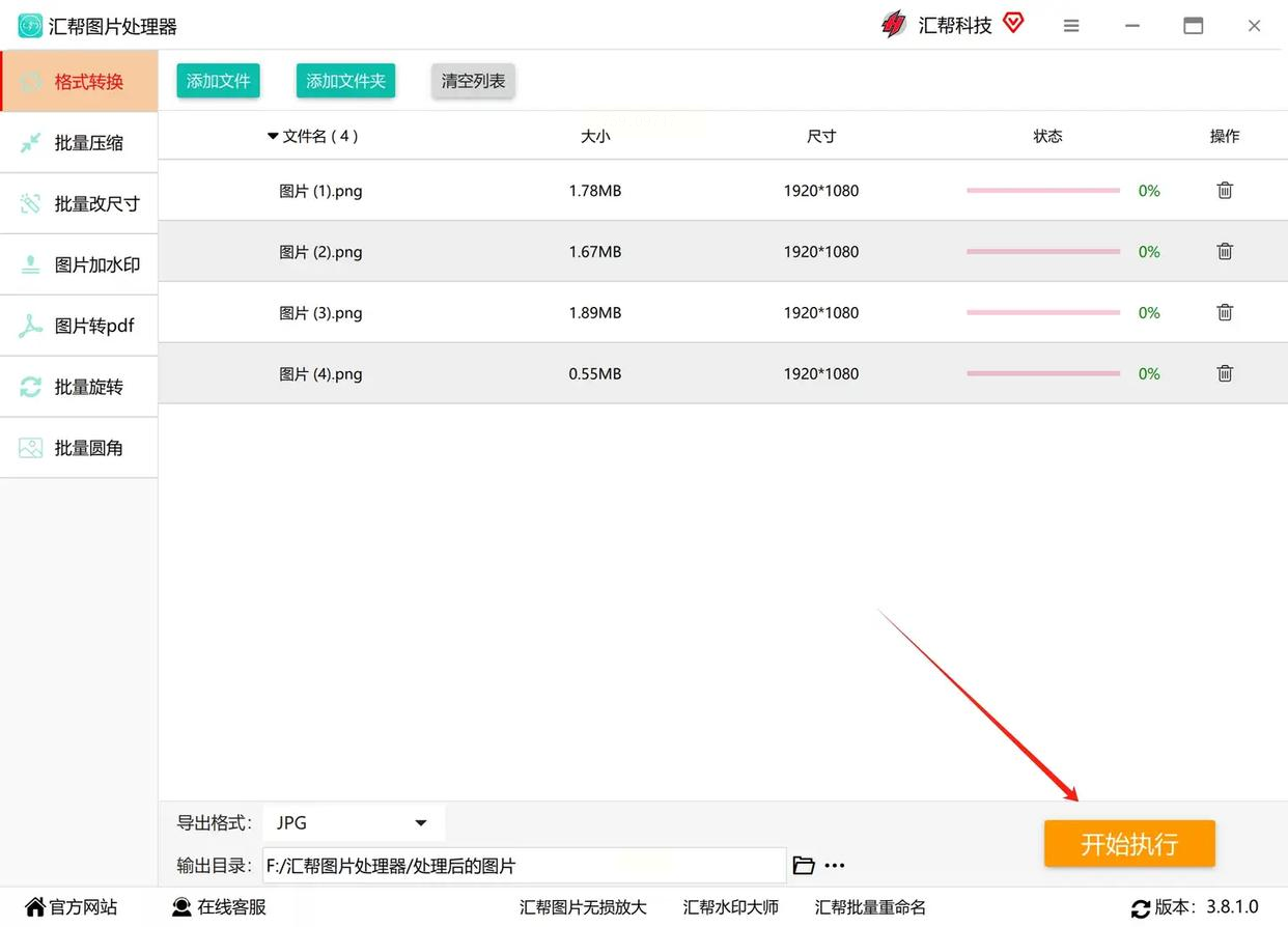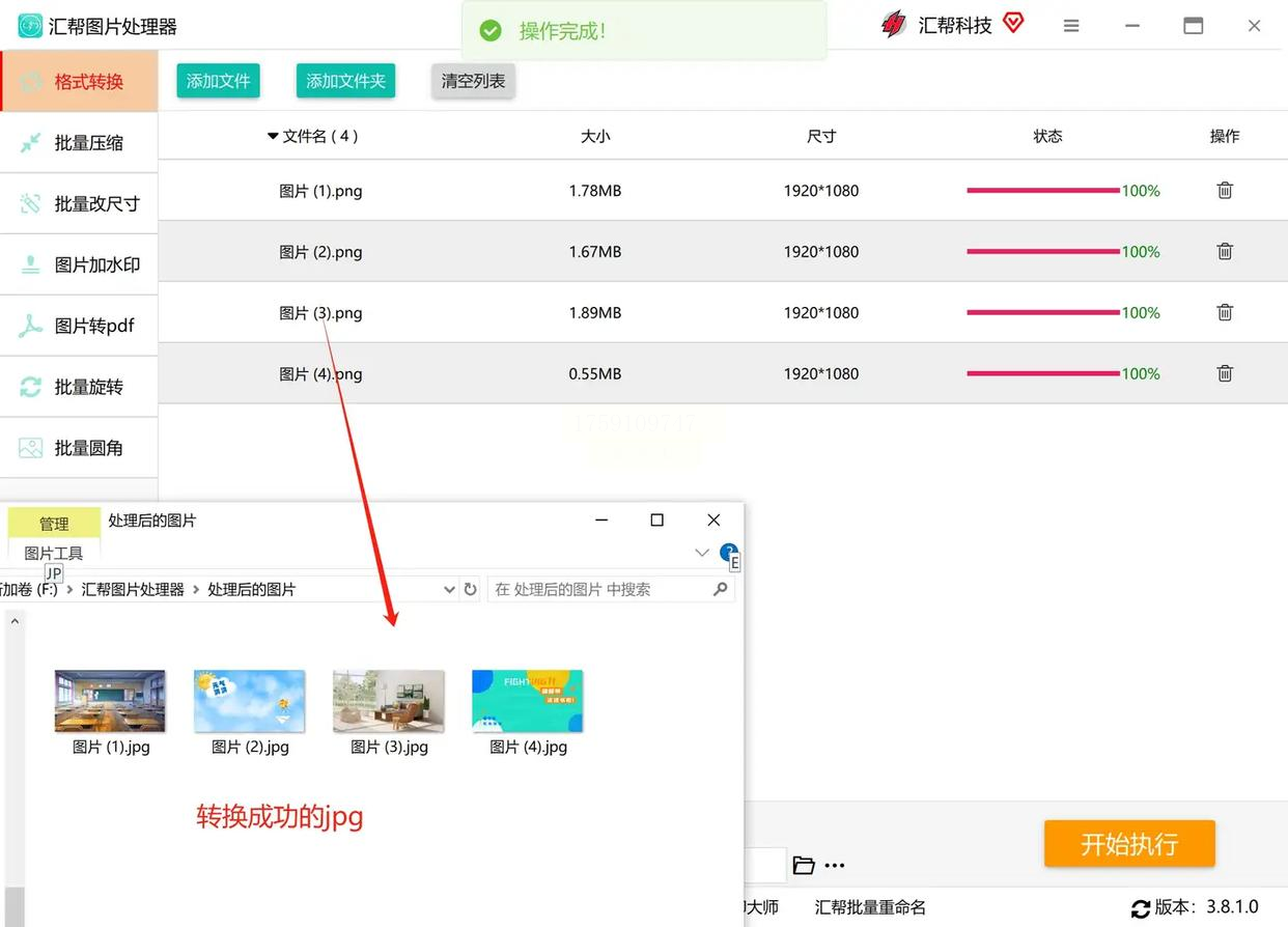 第三步,点击【开始执行】按钮,软件就会自动处理。转换过程中,你可以看到进度条在动,一般几秒钟就搞定。